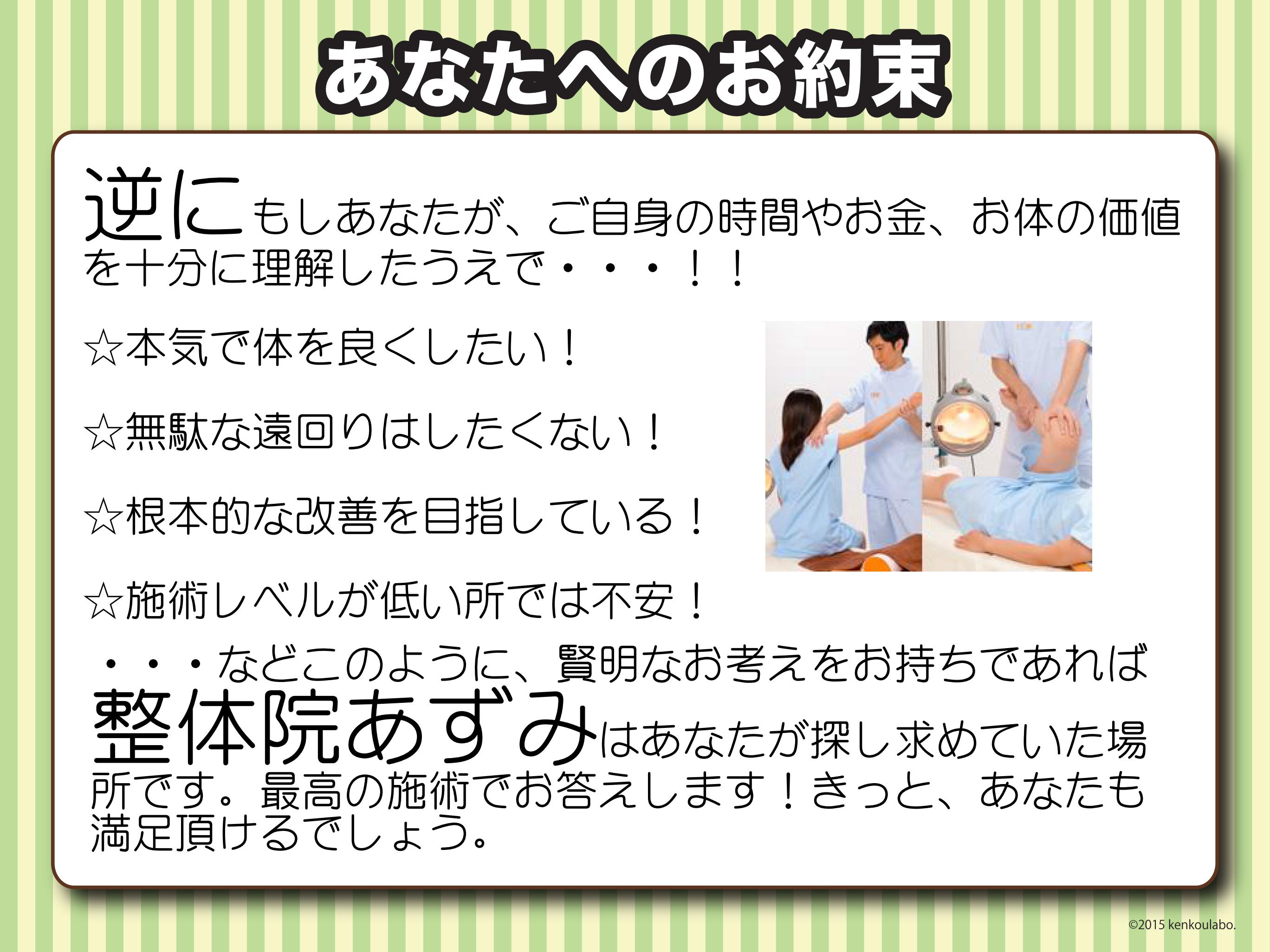 結果の出る整体院をお探しの方なら諫早市西里町にある整体院あずみTS。西長田バス停横(上り)。地域No.1の整体院を目指します。土曜・祝日も受付、無料電話相談あり、駐車場あり、結果重視の整体治療院。