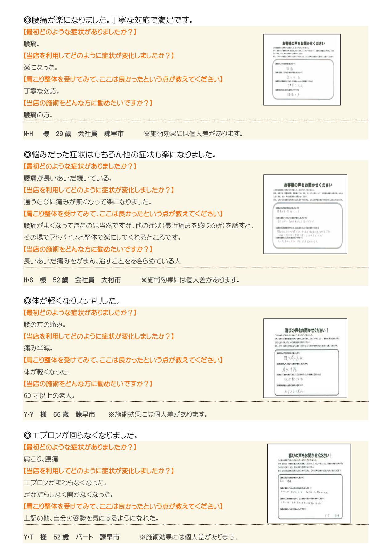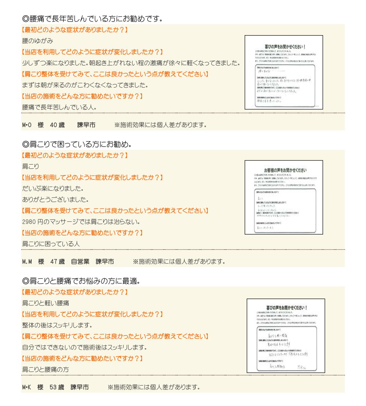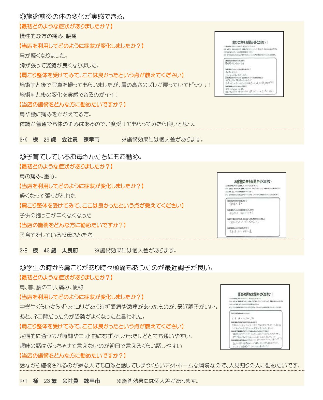 口コミ・体験談 -  腰痛・肩痛・膝痛・肩こりでお悩みならなら諫早市の整体院あずみTS