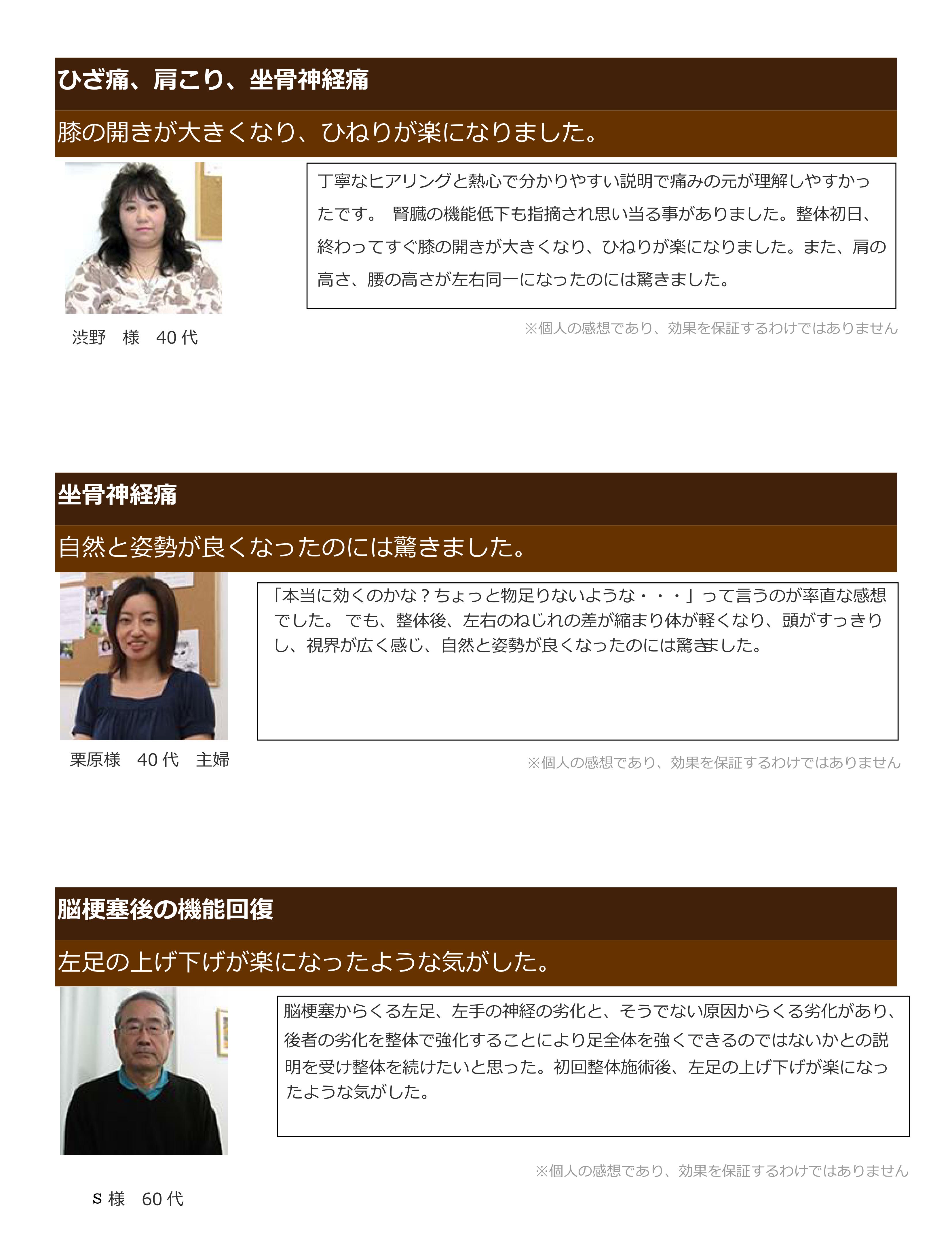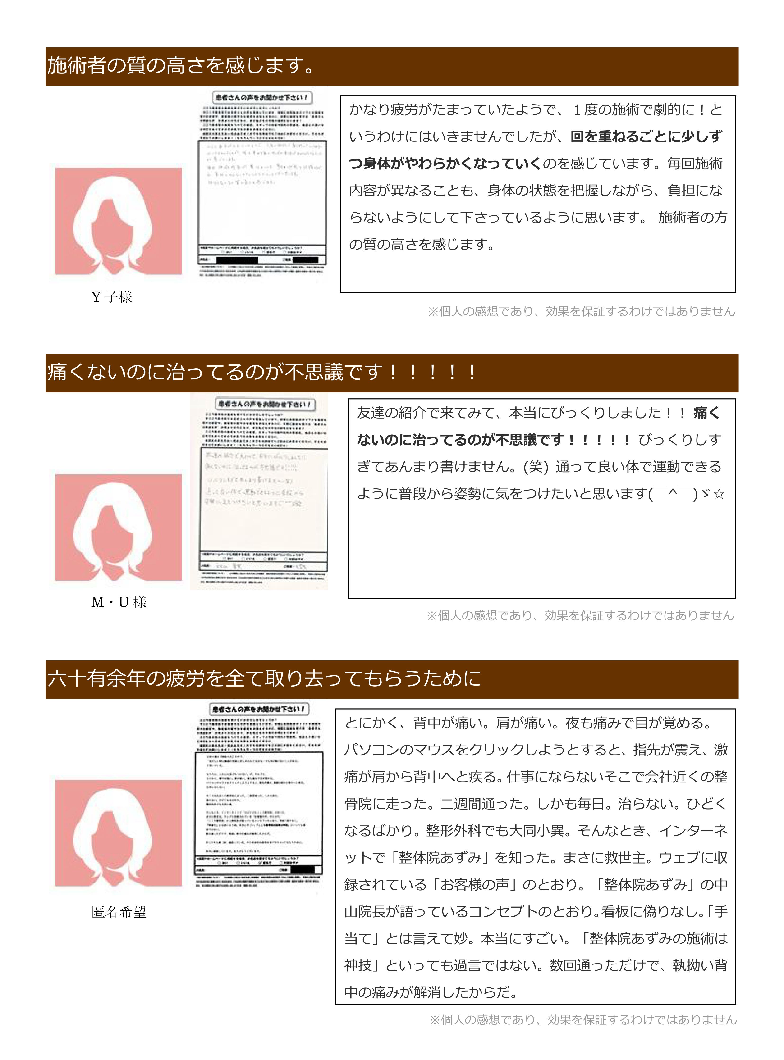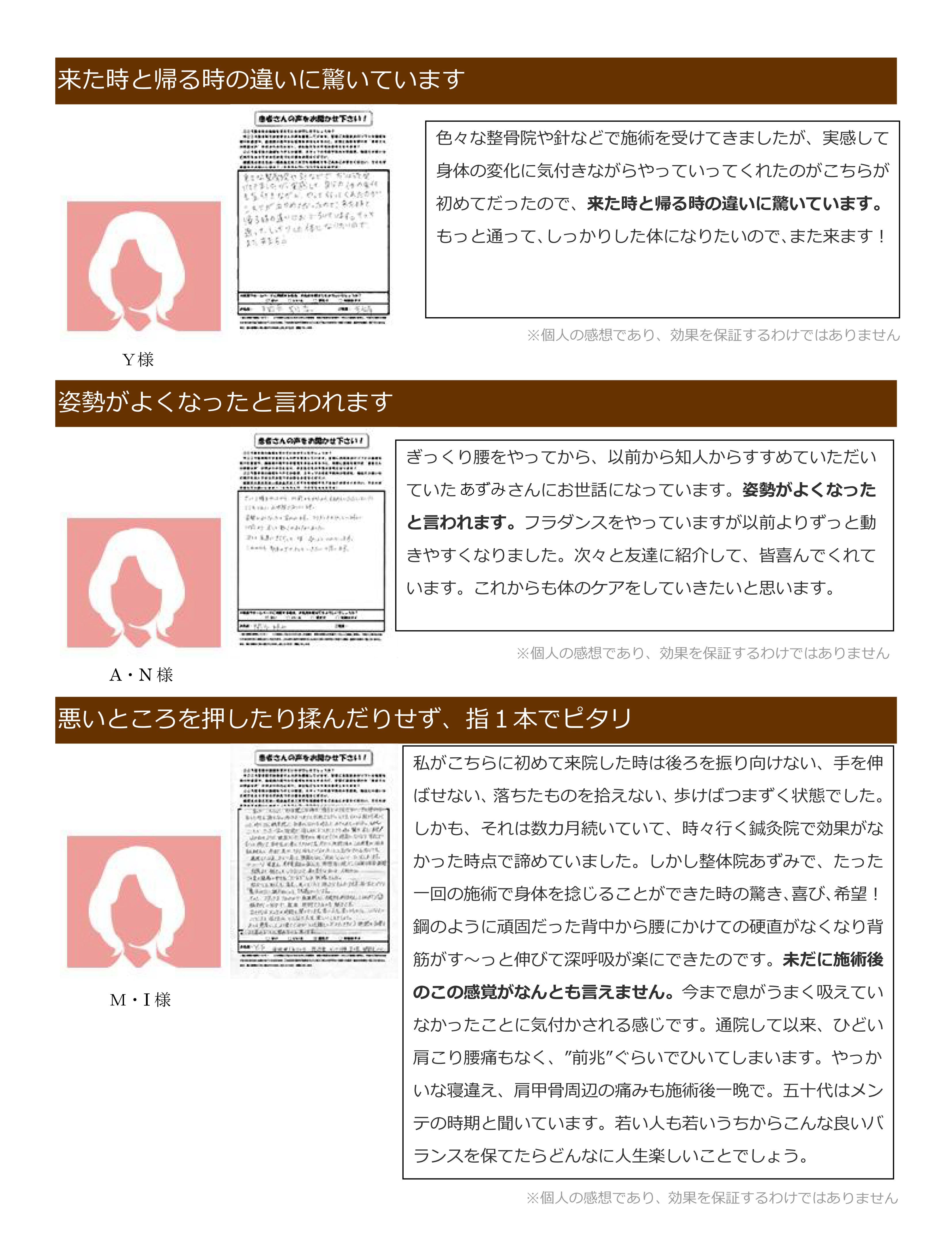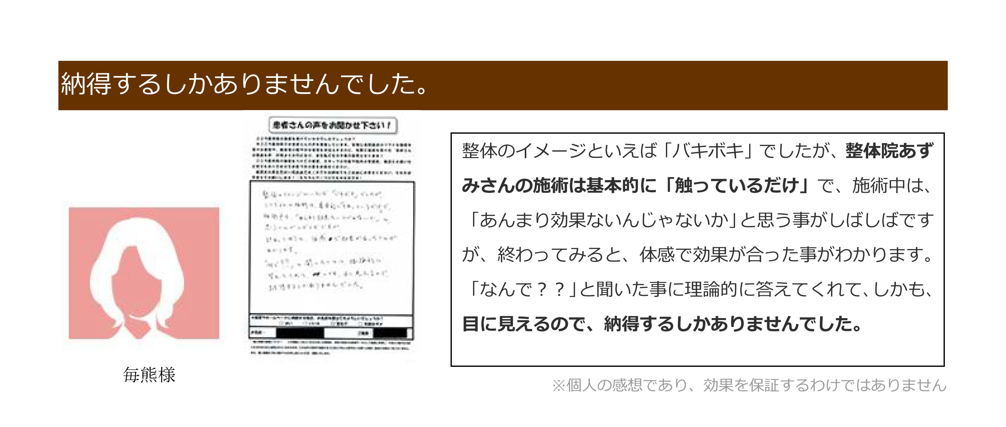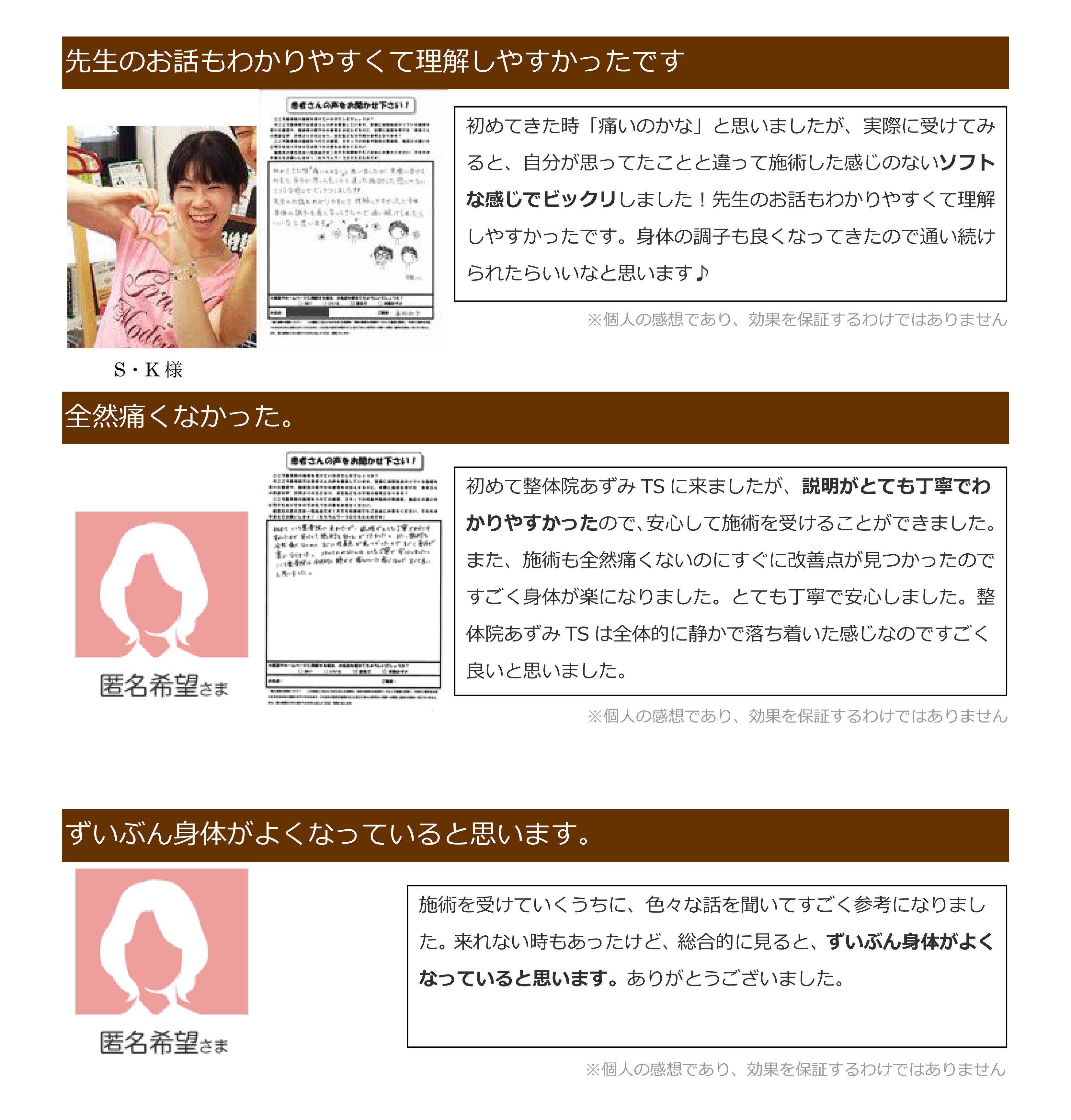 結果の出る整体院をお探しの方なら諫早市西里町にある整体院あずみTS。西長田バス停横(上り)。地域No.1の整体院を目指します。土曜・祝日も受付、無料電話相談あり、駐車場あり、結果重視の整体治療院。
